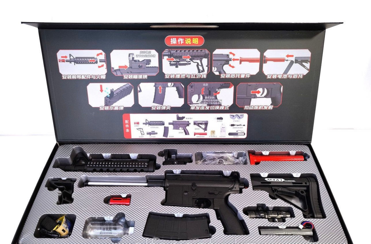 1x M4A1 | 1x Mag | 1x Rechargeable battery + USB charger | 1x Scope (green dot) | 1x Bag of gel balls